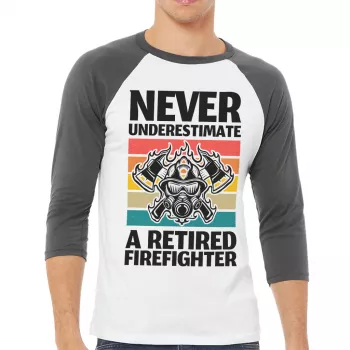 Never Underestimate a Retired Firefighter Baseball T-Shirt – Firefighter Retirement 3/4 Sleeve – Retirement Gift Raglan Jersey Shirt