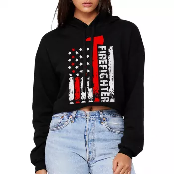 Firefighter Axe Flag Women’s Cropped Hoodie – Firefighters Thin Red Line Hooded Sweatshirt – USA Flag Super Crop Top Hoodies