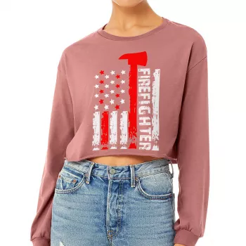 Firefighter Axe Flag Cropped Long Sleeve Sweatshirt – USA Flag Women’s Crop Top – Firefighters Thin Red Line Long Sleeves Pullover