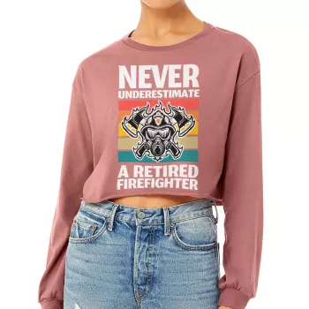 Never Underestimate a Retired Firefighter Cropped Long Sleeve Sweatshirt – Firefighter Retirement Women’s Crop Top – Retirement Gift Long Sleeves Pullover